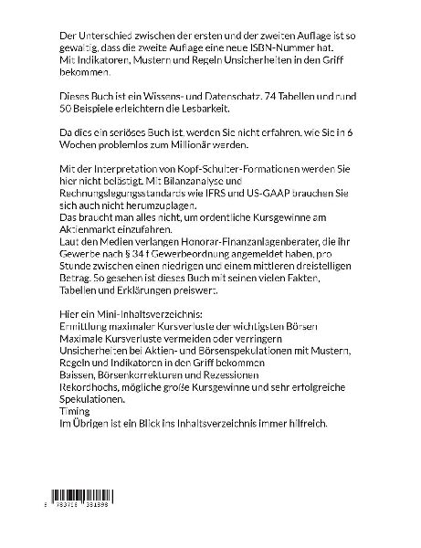 Der Unterschied zwischen der ersten und der zweiten Auflage ist so gewaltig, dass die zweite Auflage eine neue ISBN-Nummer hat.Mit Indikatoren, Mustern und Regeln Unsicherheiten in den Griff bekommen.Dieses Buch ist ein Wissens- und Datenschatz. 74 Tabellen und rund 50 Beispiele erleichtern die Lesbarkeit.Da dies ein seriöses Buch ist, werden Sie nicht erfahren, wie Sie in 6 Wochen problemlos zum Millionär werden.Mit der Interpretation von Kopf-Schulter-Formationen werden Sie hier nicht belästigt. Mit Bilanzanalyse und Rechnungslegungsstandards wie IFRS und US-GAAP brauchen Sie sich auch nicht herumzuplagen. Das braucht man alles nicht, um ordentliche Kursgewinne am Aktienmarkt einzufahren.Laut den Medien verlangen Honorar-Finanzanlagenberater, die ihr Gewerbe nach § 34 f Gewerbeordnung angemeldet haben, pro Stunde zwischen einen niedrigen und einem mittleren dreistelligen Betrag. So gesehen ist dieses Buch mit seinen vielen Fakten, Tabellen und Erklärungen preiswert.Hier ein Mini-Inhaltsverzeichnis:Ermittlung maximaler Kursverluste der wichtigsten BörsenMaximale Kursverluste vermeiden oder verringernUnsicherheiten bei Aktien- und Börsenspekulationen mit Mustern, Regeln und Indikatoren in den Griff bekommenBaissen, Börsenkorrekturen und RezessionenRekordhochs, mögliche große Kursgewinne und sehr erfolgreiche Spekulationen.TimingIm Übrigen ist ein Blick ins Inhaltsverzeichnis immer hilfreich. (lib)