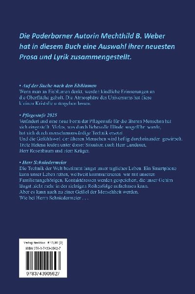 Wenn man an Eisblumen denkt, die früher durch die kalten und frostigen Nächte die Fenster der Häuser geschmückt haben, werden kindliche Erinnerungen wieder an die Oberfläche geholt. Die Athmosphäre des Universums hat sich verändert und die kleinen Kristalle untergehen lassen. Auch die Art der Pflegestufe der Menschen in den Pflegeheimen und Altenheimen hat sich verändert. Vieles, was durch die Hände liebevoller Pflegekräfte ausgeführt wurde, ist durch die unwürdige Technik eines Roboters ersetzt worden. Die Gefühlswelt der älteren Menschen wird durch sie auf eine harte Probe gestellt. Gerade ältere Menchen wünschen sich ein liebes Wort und eine tröstende Hand einer Pflegerin.Jedoch wird die Pflege eines alten und kranken Menschen durch eine kalte Hand ausgeübt. Die Technik bestimmt längst unser tägliches Leben, Ein Smartphone ist ein Teil unseres Tagesablaufes geworden. Wir können mit ihm Menschen erreichen, die am anderen Ende der Welt leben. Es kann hunderte Kontaktadressen speichern, die unser Gehirn längst nicht mehr in der richtigen Reihenfolge speichern kann. Es ist in der Lage, für uns Arbeitsgänge zu erledigen, für die wir ohne diese Technik Stunden benötigen würden. Aber wehe, wenn dieser Fortschritt zur Geißel der Menschheit wird.Wie bei Herrn Schniedermeier..... (lib)