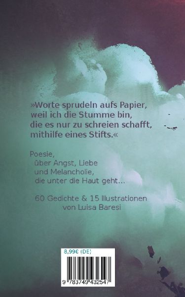»Die Worte sprudeln aufs Papier, weil ich die Stumme bin, die es nur zu schreien schafft, mithilfe eines Stifts.« Poesie, über Angst, Liebe und Melancholie, die unter die Haut geht... 60 Gedichte & 15 Illustrationen von Luisa Baresi Schriftlich fixierte Gefühle, unteranderem Situationen des Lebens, die Angst erzeugen sind in diesem Lyrikband festgehalten. Wiederkehrende Themen sind neben dem Umgang und der Wahrnehmung von Ängsten, (unerfüllte) Liebe und die Zerbrechlichkeit von Vertrauen. Die Gedichte sind modern, greifbar und mit unkonventionellen Erkenntnissen gespickt, die teilweise über die reale Lebenswelt hinausgehen.