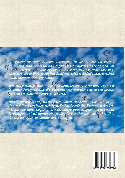 Ob Fragen aus dem Inneren, ob Fragen in das Äußere, ob Fragen durch den Hausverstand, ob Fragen an Geschichten oder Fragen um die Sinnlichkeit, sie alle zeigen die Facetten des Bewusstseins, welches sich einer Wahrhaftigkeit inmitten solcher Individualitätsvielfalt kaum mehr gewiss sein kann. Wie lange festigen wir uns jedoch darin jeweils nur für uns, wenn wir in reiner Interpretation die Blickrichtung verschroben enden lassen, quer zu unzählbaren, anderen Geistern?Im Gegensatz zur objektiven Sachlichkeit, die zeitlich alles für ein jedes und für einen jeden richtig stellt, hat Poesie die Kraft zu mehr: Die Macht, von einer inspirierten Einzelfrage über Möglichkeiten anstatt Deutungen auf wiederum ein großes Ganzes hinzuweisen, ohne ihm Gestalt aus Missverständnis aufzudrängen. (lib)