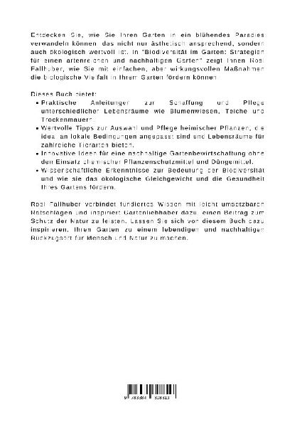 ntdecken Sie, wie Sie Ihren Garten in ein blühendes Paradies verwandeln können, das nicht nur ästhetisch ansprechend, sondern auch ökologisch wertvoll ist. In "Biodiversität im Garten: Strategien für einen artenreichen und nachhaltigen Garten" zeigt Ihnen Rosl Fallhuber, wie Sie mit einfachen, aber wirkungsvollen Maßnahmen die biologische Vielfalt in Ihrem Garten fördern können.Dieses Buch bietet:Praktische Anleitungen zur Schaffung und Pflege unterschiedlicher Lebensräume wie Blumenwiesen, Teiche und Trockenmauern.Wertvolle Tipps zur Auswahl und Pflege heimischer Pflanzen, die ideal an lokale Bedingungen angepasst sind und Lebensräume für zahlreiche Tierarten bieten.Innovative Ideen für eine nachhaltige Gartenbewirtschaftung ohne den Einsatz chemischer Pflanzenschutzmittel und Düngemittel.Wissenschaftliche Erkenntnisse zur Bedeutung der Biodiversität und wie sie das ökologische Gleichgewicht und die Gesundheit Ihres Gartens fördern.Rosl Fallhuber verbindet fundiertes Wissen mit leicht umsetzbaren Ratschlägen und inspiriert Gartenliebhaber dazu, einen Beitrag zum Schutz der Natur zu leisten. Lassen Sie sich von diesem Buch dazu inspirieren, Ihren Garten zu einem lebendigen und nachhaltigen Rückzugsort für Mensch und Natur zu machen. (lib)