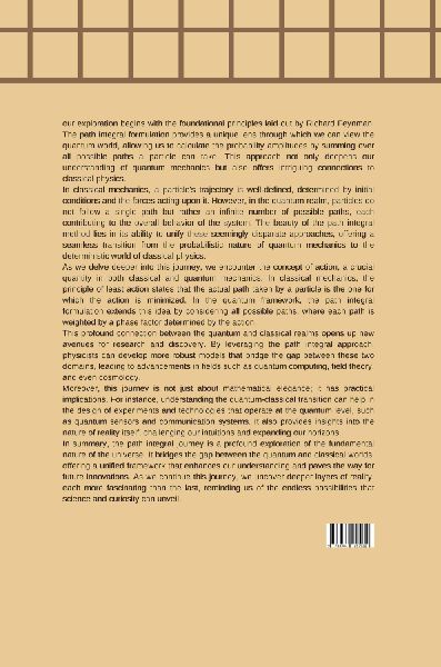 "Bridging Quantum and Classical: A Path Integral Journey" delves into the fascinating concept of Feynman Path Integrals. Unlike the strange ideas often associated with quantum mechanics, path integrals offer an intuitive bridge between the familiar world of classical mechanics and the bizarre realm of the quantum. This book explains how particles, unlike billiard balls on a table, explore every possible path between two points, with some paths influencing the outcome more than others. Through this path integral approach, you'll gain a deeper understanding of the quantum world and its connection to our everyday reality. (lib)