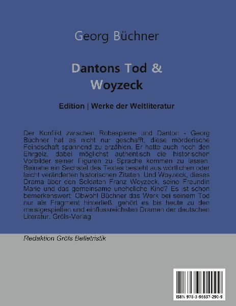 Der Konflikt zwischen Robespierre und Danton - Georg Büchner hat es nicht nur geschafft, diese mörderische Feindschaft spannend zu erzählen. Er hatte auch noch den Ehrgeiz, dabei möglichst authentisch die historischen Vorbilder seiner Figuren zu Sprache kommen zu lassen. Beinahe ein Sechstel des Textes besteht aus wörtlichen oder leicht veränderten historischen Zitaten. Und Woyzeck, dieses Drama über den Soldaten Franz Woyzeck, seine Freundin Marie und das gemeinsame uneheliche Kind? Es ist schon bemerkenswert: Obwohl Büchner das Werk bei seinem Tod nur als Fragment hinterließ, gehört es bis heute zu den meistgespielten und einflussreichsten Dramen der deutschen Literatur. Gröls-Verlag (lib)