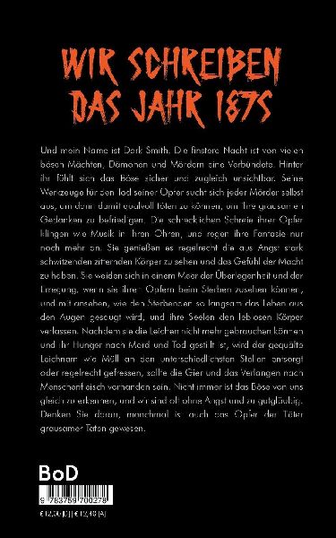 Wir schreiben das Jahr 1875.Und mein Name ist Dark Smith. Die finstere Nacht ist von vielen bösen Mächten, Dämonen und Mördern eine Verbündete. Hinter ihr fühlt sich das Böse sicher und zugleich unsichtbar. Seine Werkzeuge für den Tod seiner Opfer sucht sich jeder Mörder selbst aus, um dann damit qualvoll töten zu können, um ihre grausamen Gedanken zu befriedigen. Die schrecklichen Schreie ihrer Opfer klingen wie Musik in ihren Ohren, und regen ihre Fantasie nur noch mehr an. Sie genießen es regelrecht die aus Angst stark schwitzenden zitternden Körper zu sehen und das Gefühl der Macht zu haben. Sie weiden sich in einem Meer der Überlegenheit und der Erregung, wenn sie ihren Opfern beim Sterben zusehen können, und mit ansehen, wie den Sterbenden so langsam das Leben aus den Augen gesaugt wird, und ihre Seelen den leblosen Körper verlassen. Nachdem sie die Leichen nicht mehr gebrauchen können und ihr Hunger nach Mord und Tod gestillt ist, wird der gequälte Leichnam wie Müll an den unterschiedlichsten Stellen entsorgt oder regelrecht gefressen, sollte die Gier und das Verlangen nach Menschenfleisch vorhanden sein. Nicht immer ist das Böse von uns gleich zu erkennen, und wir sind oft ohne Angst und zu gutgläubig.Denken Sie daran, manchmal ist auch das Opfer der Täter grausamer Taten gewesen. (lib)