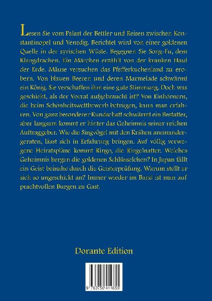 Lesen Sie vom Palast der Bettler und Reisen zwischen Konstantinopel und Venedig. Berichtet wird von einer goldenen Quelle in der syrischen Wüste. Begegnen Sie Song-Fu, dem Klangdrachen. Ein Märchen erzählt von der kranken Haut der Erde. Mäuse versuchen das Pfefferkuchenland zu erobern. Von blauen Beeren und deren Marmelade schwärmt ein König. Sie verschaffen ihm eine gute Stimmung. Doch was geschieht, als der Vorrat aufgebraucht ist? Von Einhörnern, die beim Schönheitswettbewerb betrügen, kann man erfahren. Von ganz besonderer Kundschaft schwärmt ein Bestatter, aber langsam kommt er hinter das Geheimnis seiner reichen Auftraggeber. Wie die Singvögel mit den Krähen aneinandergeraten, lässt sich in Erfahrung bringen. Auf völlig verwegene Heiratspläne kommt Ringo, die Ringelnatter. Welches Geheimnis bergen die goldenen Schlüsselchen? In Japan fällt ein Geist beinahe durch die Geisterprüfung. Warum stellt er sich so ungeschickt an? Immer wieder im Band ist man auf prachtvollen Burgen zu Gast. (lib)