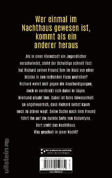 Wer einmal im Nachthaus gewesen ist, kommt als ein anderer heraus Als in einer Kleinstadt ein Jugendlicher verschwindet, steht der Schuldige schnell fest: Hat Richard seinen Freund Tom im Wald von einer Brücke in den reißenden Fluss gestoßen? Richard wehrt sich gegen die Anschuldigungen, doch er verstrickt sich dabei in Lügen. Niemand glaubt ihm. Dabei ist Toms Abwesenheit so ungeheuerlich, dass Richard selbst kaum noch zu atmen wagt. Seine Suche nach dem Freund führt ihn auf die dunkle Seite von Ballantyne. Dort steht das Nachthaus. Was geschah in jener Nacht?