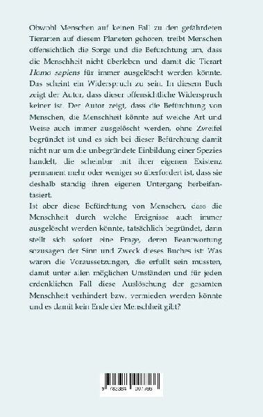 Obwohl Menschen auf keinen Fall zu den gefährdeten Tierarten auf diesem Planeten gehören, treibt Menschen offensichtlich die Sorge und die Befürchtung um, dass die Menschheit nicht überleben und damit die Tierart Homo sapiens für immer ausgelöscht werden könnte. Das scheint ein Widerspruch zu sein.In diesem Buch zeigt der Autor, dass dieser offensichtliche Widerspruch keiner ist. Der Autor zeigt, dass die Befürchtung von Menschen, die Menschheit könnte auf welche Art und Weise auch immer ausgelöscht werden, ohne Zweifel begründet ist und es sich bei dieser Befürchtung damit nicht nur um die unbegründete Einbildung einer Spezies handelt, die scheinbar mit ihrer eigenen Existenz permanent mehr oder weniger so überfordert ist, dass sie deshalb ständig ihren eigenen Untergang herbeifantasiert. Ist aber diese Befürchtung von Menschen, dass die Menschheit durch welche Ereignisse auch immer ausgelöscht werden könnte, tatsächlich begründet, dann stellt sich sofort eine Frage, deren Beantwortung sozusagen der Sinn und Zweck dieses Buches ist: Was wären die Voraussetzungen, die erfüllt sein müssten, damit unter allen möglichen Umständen und für jeden erdenklichen Fall diese Auslöschung der gesamten Menschheit verhindert bzw. vermieden werden könnte und es damit kein Ende der Menschheit geben würde? (lib)