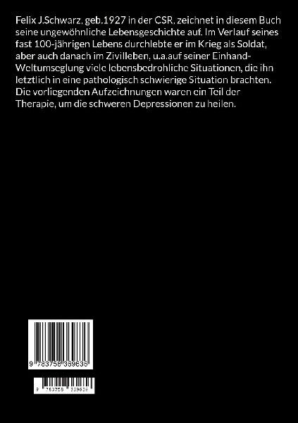 Felix J.Schwarz, geb.1927 in der CSR, zeichnet in diesem Buch seine ungewöhnliche Lebensgeschichte auf. Im Verlauf seines fast 100-jährigen Lebens durchlebte er im Krieg als Soldat, aber auch danach im Zivilleben, u.a.auf seiner Einhand-Weltumseglung viele lebensbedrohliche Situationen, die ihn letztlich in eine pathologisch schwierige Situation brachten.Die vorliegenden Aufzeichnungen waren ein Teil der Therapie, um die schweren Depressionen zu heilen. (lib)