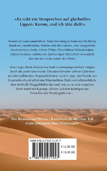 Arkeen ist Karawanenführer. Seine Berufung ist keine leichte Bürde - Banditen, Sanddrachen, Stürme und die Kadrass, eine kriegerische Insektenrasse, fordern ihren Tribut. Die erlebten Verluste haben Arkeen in einen verbitterten, hartherzigen Menschen verwandelt, der nur eine Liebe kennt: die Wüste.Eines Tages führt Arkeen eine bunt zusammengewürfelte Truppe durch die große Sandwüste. Darunter befinden sich ein Gelehrter aus den Gelblanden, Bogenschützinnen und Krieger, ein Druide, ein Feuerkobold und selbst eine Mümmelfrau. Bald wird offensichtlich, dass nicht alle Weggefährten das sind, was sie zu sein vorgeben. Doch damit nicht genug: Düstere Zeichen kündigen das Erwachen der Wüstengötter an ...DIE HERREN DER WÜSTE - KARAWANE ist der erste Teil eines fantasiereichen Wüstenepos. Der zweite Band erscheint voraussichtlich Anfang 2020. (lib)