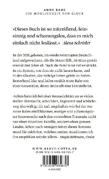 'Selten habe ich bei einer Romanlektüre an so vielen Stellen überrascht, schockiert, begeistert und schlichtweg überwältigt die Luft angehalten wie bei der von Anne Rabes einfühlsamer, mutiger und schonungsloser Spurensuche nach den versteckten Traumata nicht nur einer einzelnen Familie, sondern eines ganzen Landes. Schon nach wenigen Seiten dieses Romans stand für mich fest, welchen meiner Kund:innen ich ihn empfehlen würde: allen!' Magda Birkmann, Ocelot