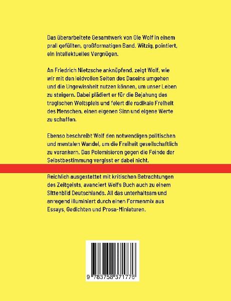 Das überarbeitete Gesamtwerk von Ole Wolf in einem prall gefüllten, großformatigen Band. Witzig, pointiert, ein intellektuelles Vergnügen.An Friedrich Nietzsche anknüpfend, zeigt Wolf, wie wir mit den leidvollen Seiten des Daseins umgehen und die Ungewissheit nutzen können, um unser Leben zu steigern. Dabei plädiert er für die Bejahung des tragischen Weltspiels und feiert die radikale Freiheit des Menschen, einen eigenen Sinn und eigene Werte zu schaffen.Ebenso beschreibt Wolf den notwendigen politischen und mentalen Wandel, um die Freiheit gesellschaftlich zu verankern. Das Polemisieren gegen die Feinde der Selbstbestimmung vergisst er dabei nicht.Reichlich ausgestattet mit kritischen Betrachtungen des Zeitgeists, avanciert Wolfs Buch auch zu einem Sittenbild Deutschlands. All das unterhaltsam und anregend illuminiert durch einen Formenmix aus Essays, Gedichten und Prosa-Miniaturen. (lib)