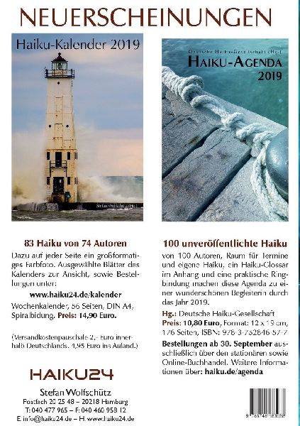 SOMMERGRAS ist die alle drei Monate erscheinende Zeitschrift der Deutschen Haiku Gesellschaft (DHG).Die Ausgabe 123 (Dezember 2018) enthält u. a ausgewählte Haiku, Tanka, Haiga, Haibun, Tan-Tenga und Kettengedichte der Mitglieder, den 2. Teil des interessanten Aufsatzes zur wabi-sabi-Ästhetik und einen neuen Aufruf zum Haiku-Dichten. (lib)