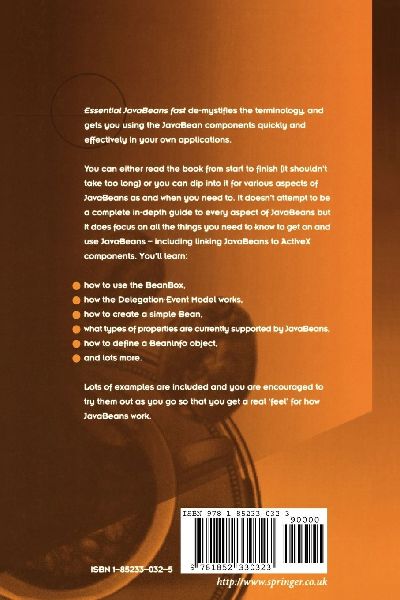 Essential JavaBeans fast de-mystifies the terminology and gets programmers using the JavaBean components quickly and effectively in their own applications. Programmers can either read the book from start-to-finish (it shouldnt take long) or can dip into it for various aspects of JavaBeans where needed. The book focuses on all the necessary elements for getting started on and using JavaBeans. Many examples are included and readers are encouraged to try them out as they go, to get a real feel for how JavaBeans work. (lib)