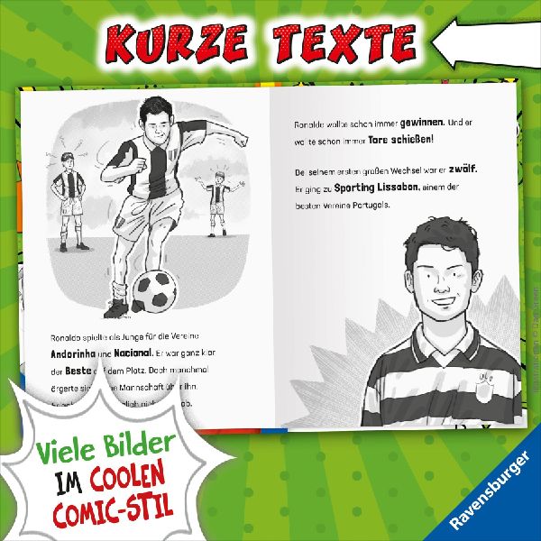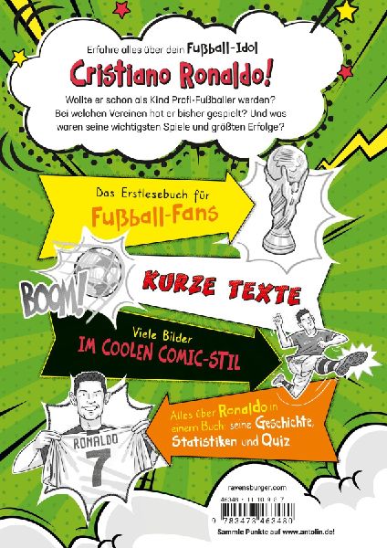 Das perfekte Fußball-Geschenk für Jungen und Mädchen, die gar nicht genug Wissen über Ronaldo sammeln können. In einer Geschichte lesen sie alles über seinen Weg vom kickenden Jungen bis zum Weltfußballer: Wollte er immer Profifußballer werden? Bei welchen Vereinen hat er gespielt? Und was waren seine wichtigsten Spiele und Tore? In kindgerechten Statistiken können sie Spannendes über ihr Fußballidol lernen und sich im Ronaldo-Quiz testen. So wird Lesenlernen zum Volltreffer!
