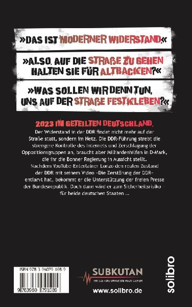 2023 im geteilten Deutschland. Der Widerstand in der DDR findet nicht mehr auf der Straße statt, sondern im Netz. Die DDR-Führung strebt die strengere Kontrolle des Internets und Zerschlagung der Oppositionsgruppen an, braucht aber Milliardenhilfen in D-Mark, die ihr die Bonner Regierung in Aussicht stellt. Nachdem YouTube-Entertainer Lonzo den realen Zustand der DDR mit seinem Video »Die Zerstörung der DDR« entlarvt hat, bekommt er die Unterstützung der freien Presse der Bundesrepublik. Doch dann wird er zum Sicherheitsrisiko - für beide deutschen Staaten ...
