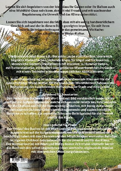 Lassen Sie sich begeistern von der Idee, dass Ihr Garten oder Ihr Balkon auch eine Wohlfühl-Oase sein kann, der mit viel Freude und mit wachsender Begeisterung die Umwelt und das Klima unterstützt. Lassen Sie sich begeistern von der Idee, dass mit ein wenig handwerklichem Geschick anhand der in diesem Buch gezeigten Impulse, Sie mit Ihren Schwarm-Beiträgen beitragen für das gemeinsame Vielfache: eine zukunftsfähige Wohn-Kultur.Die Buchserie zeigt Ihnen z.B.:Berankte Laube statt Pavillon, ideenreich begrünte Kleinstflächen, blühende Inseln für Vögel und für Insekten, ideenreiche Garten-Dekorationen mit Insekten- u. Hummel-Hotels, mit Futterstationen, mit kleinen oder größeren Wasserbereichen im Garten mit einem Teichufer statt dem sonst üblichen Abbruchkrater.Jeder Kleinstbeitrag ist im Schwarm die umfassende Klammer für die zukunftsfähige Wohn-Kultur, für die spannende Wohlfühlinsel Zuhause, die Reduzierung des zunehmenden Aufheizens der Stadt und vieles mehr.Die übersichtlich strukturierten Beiträge in dem Buch werden ergänzt mit ideenreichen Ressourcen-Spartipps für den Betrieb von Gärten. Abholend für Neustarter.Der Verlauf des Buches ist mit Wort und mit Bild verständlich ausgerichtet auch auf die Aufgeschlossenen, welche sich neu oder relativ neu interessieren für die Chancen und für die Beitragsmöglichkeiten, mit wenig Aufwand in dem eigenen Outdoor-Lebensbereich spannende und zugleich wohlige Bereiche zu schaffen, die wertvolle Schwarm-Beiträge sind für die Umwelt und für das Klima.Ideen gebend für Profis.Der Verlauf des Buches ist mit Wort und mit Bild ergänzend und detailliert ausgerichtet auf die Aufgeschlossenen, welche sich bereits intensiver beschäftigt haben mit den Chancen und den Möglichkeiten wertvoller Beiträge im eigenen Outdoor-Lebensbereich für die Umwelt und für das Klima. Der Buchverlauf ist mit Wort und Bild zu keiner Zeit trivial, vielmehr bietet das Buch mit den selbst umgesetzten Ideen wertvolle, ergänzende Impulse mit ideenreichen Umsetzungshinweisen. (lib)