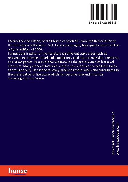 Lectures on the History of the Church of Scotland - from the Reformation to the Revolution Settlement - Vol. 1 is an unchanged, high-quality reprint of the original edition of 1860.Hansebooks is editor of the literature on different topic areas such as research and science, travel and expeditions, cooking and nutrition, medicine, and other genres. As a publisher we focus on the preservation of historical literature. Many works of historical writers and scientists are available today as antiques only. Hansebooks newly publishes these books and contributes to the preservation of literature which has become rare and historical knowledge for the future. (lib)