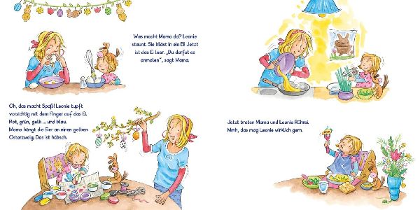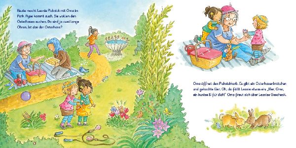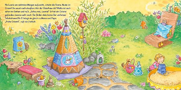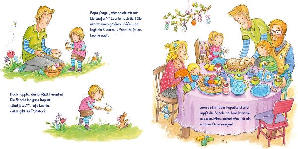 Leonie ist schon ganz gespannt, denn bald ist Ostern. In der Kita tollt sie durch die Blumenwiese und hält neugierig Ausschau, ob die Ostereier vielleicht schon früher versteckt wurden. Mit Mama malt sie Eierschalen bunt und schenkt Oma ein hübsches Osterei. Beim Picknick im Park macht sich Leonie mit ihrer besten Freundin auf die Suche nach dem Osterhasen. Und schließlich ist der Ostermorgen da! Leonie findet viele kleine Osternester, Papa spielt mit ihr und Malte Eierlaufen und dann lassen sich alle das gemeinsame Osterfrühstück in der Sonne schmecken. (lib)