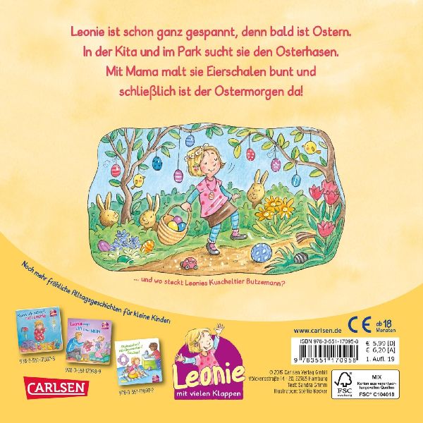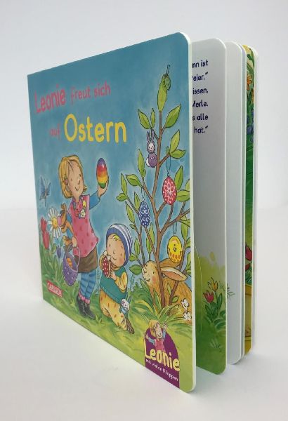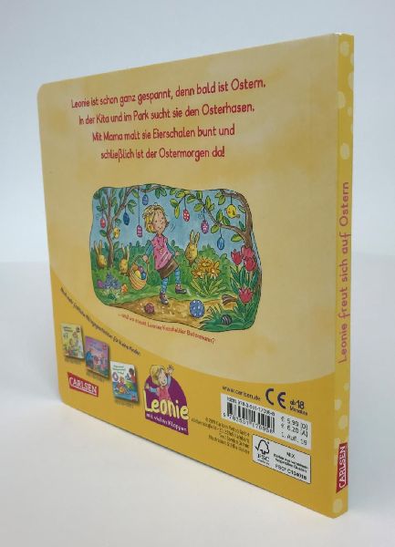 Leonie ist schon ganz gespannt, denn bald ist Ostern. In der Kita tollt sie durch die Blumenwiese und hält neugierig Ausschau, ob die Ostereier vielleicht schon früher versteckt wurden. Mit Mama malt sie Eierschalen bunt und schenkt Oma ein hübsches Osterei. Beim Picknick im Park macht sich Leonie mit ihrer besten Freundin auf die Suche nach dem Osterhasen. Und schließlich ist der Ostermorgen da! Leonie findet viele kleine Osternester, Papa spielt mit ihr und Malte Eierlaufen und dann lassen sich alle das gemeinsame Osterfrühstück in der Sonne schmecken.