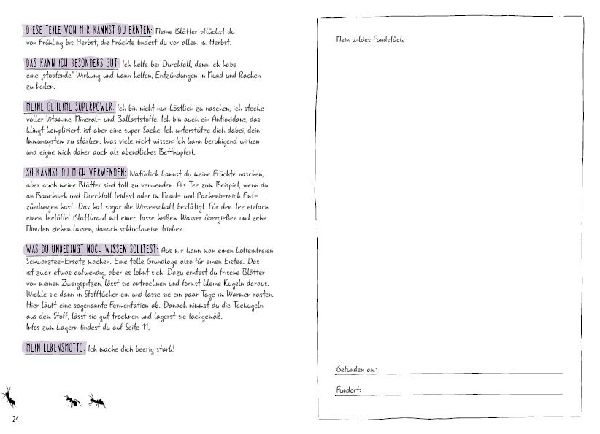 Manche der gesammelten Pflanzenschätze lassen sich direkt naschen, andere müssen vor der Weiterverarbeitung sorgfältig getrocknet und gelagert werden. Ob Fichtenbutter schütteln, Waldmeisterlimo brauen oder selbst ein Blütenbild klopfen: einfach ausprobieren und Spaß haben. Genügend Platz zum Einkleben der eigenen Entdeckungen ist in diesem hübschen Buch ebenfalls vorhanden. Außerdem warten Ausmalbilder auf die kleinen Farbstiftkünstler. Pflanzen-Quizfragen runden das vielseitige Mitmachbuch ab. Ein kräuterpädagogisch rundum gelungenes Buch!