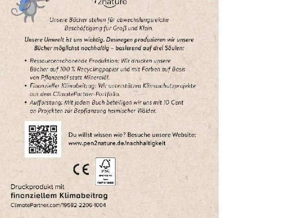 Für mehr Nachhaltigkeit im Alltag: Dieses Buch wurde mit Farben ohne Mineralöl und auf 100 % Recyclingpapier gedruckt. Rest-Emissionen werden durch die Unterstützung von Umweltprojekten ausgeglichen. Zusätzlich beteiligt sich der Verlag pen2nature mit jedem Buch mit 10 Cent an Projekten zur Bepflanzung heimischer Wälder. Wie genau das alles funktioniert? Auf seiner Website informiert der Verlag ausführlich und transparent darüber.