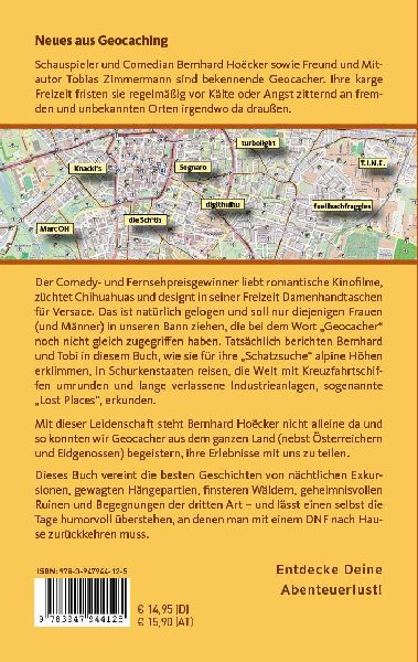 Schauspieler und Comedian Bernhard Hoëcker sowie Freund und Mitautor Tobias Zimmermann sind bekennende Geocacher. Ihre karge Freizeit fristen sie regelmäßig vor Kälte oder Angst zitternd an fremden und unbekannten Orten irgendwo da draußen.Der Comedy- und Fernsehpreisgewinner liebt romantische Kinofilme, züchtet Chihuahuas und designt in seiner Freizeit Damenhandtaschen für Versace. Das ist natürlich gelogen und soll nur diejenigen Frauen (und Männer) in unseren Bann ziehen, die bei dem Wort "Geocacher" noch nicht gleich zugegriffen haben. Tatsächlich berichten Bernhard und Tobi in diesem Buch, wie sie für ihre "Schatzsuche" alpine Höhen erklimmen, in Schurkenstaaten reisen, die Welt mit Kreuzfahrtschiffen umrunden und lange verlassene Industrieanlagen, sogenannte "Lost Places", erkunden. Mit dieser Leidenschaft steht Bernhard Hoëcker nicht alleine da und so konnten wir Geocacher aus dem ganzen Land (nebst Österreichern und Eidgenossen) begeistern, ihre Erlebnisse mit uns zu teilen.Dieses Buch vereint die besten Geschichten von nächtlichen Exkursionen, gewagten Hängepartien, finsteren Wäldern, geheimnisvollen Ruinen und Begegnungen der dritten Art - und lässt einen selbst die Tage humorvoll überstehen, an denen man mit einem DNF nach Hause zurückkehren muss. (lib)