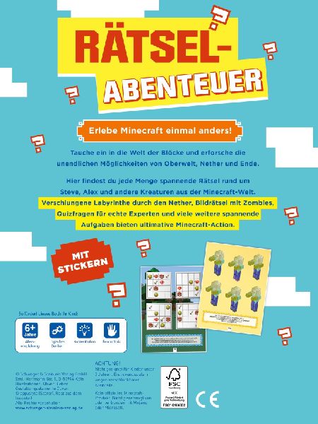 ¿Spannende Rätsel-Abenteuer für Kinder ab 6 Jahren – ein Muss für jeden Minecraft-Fan! ¿ Interaktives Erlebnis: Tauche in die faszinierende Welt von Minecraft ein, löse knifflige Rätsel und erlebe spannende Abenteuer.¿ Spannender Rätsel-Spaß für die Offline-Welt: Spielerisch knobeln und Logik trainieren - ganz ohne Computer¿ Stickerspaß: Mit vielen bunten Aufklebern für echte Minecraft-Fans!Fühlst du dich bereit für ein aufregendes Abenteuer in der Welt von Minecraft? Mit Verstand, Logik und Kreativität kannst du die spannenden Rätsel-Herausforderungen im Universum der bunten Blöcke meistern!Versetze dich in die Rolle eines mutigen Helden oder einer tapferen Heldin und löse viele abwechslungsreiche und knifflige Aufgaben. Auf 80 durchgehend farbigen Seiten erforschst du die unendlichen Möglichkeiten von Oberwelt, Nether und Ender und findest jede Menge spannende Rätsel rund um Steve, Alex und andere Kreaturen aus der Minecraft-Welt. Verschlungene Labyrinthe durch den Nether, Bilderrätsel mit Zombies, Quizfragen für echte Experten, Zeichenübungen und viele weitere spannende Aufgaben bieten ultimative Minecraft-Action.Dein besonderes Extra: 2 Seiten voller bunter Sticker! Achtung: Nicht geeignet für Kinder unter 3 Jahren. Erstickungsgefahr wegen verschluckbarer Kleinteile.¿Kein offizielles Minecraft-Produkt. Nicht genehmigt von oder verbunden mit Mojang oder Microsoft. (lib)