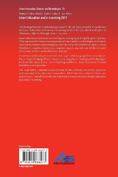 This book gathers the contributions presented at the 4th International KES Conference on Smart Education and Smart e-Learning (KES-SEEL-17), which took place in Vilamoura, Algarve, Portugal, June 21¿23, 2017.Smart education and smart e-Learning are emerging and rapidly growing areas. They represent the innovative integration of smart systems, technologies and objects, smart environments, smart pedagogy, smart learning and academic analytics, various branches of computer science and computer engineering, and state-of-the-art smart educational software and/or hardware systems. It contains a total of 48 peer-reviewed book chapters that are grouped into several parts: Part 1 ¿ Smart Pedagogy, Part 2 ¿ Smart e-Learning, Part 3 ¿ Systems and Technologies for Smart Education, Part 4 ¿ Smart Teaching, and Part 5 ¿ Smart Education: National Initiatives and Approaches. The book offers a valuable source of research data, information on best practices,and case studies for educators, researchers, Ph.D. students, administrators, and practitioners¿and all those who are interested in innovative areas of smart education and smart e-Learning. (lib)