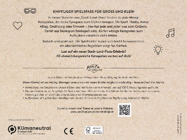 Stadt-Land-Fluß in einer neuen Dimensio ¿ 40 Kategorien für kniffligen Spielspaß ¿Vermeidung von Emissionen: Gedruckt wird mit Farben ohne Mineralöl und auf 100 % Recyclingpapier ¿ Klimaneutrale Produkte durch Ausgleich der Rest-Emissionen per Unterstützung von Umweltprojekten ¿ Aufforstung: Mit jedem Buch beteiligt sich der Verlag mit 10 Cent an Projekten zur Bepflanzung heimischer Wälder In dieser Variante von "Stadt-Land-Fluss" findest du jede Menge Kategorien, die deine Synapsen zum Glühen bringen. Ob Sport, Hobby, Natur, Alltag, Ernährung oder Umwelt: hier hat jede und jeder was zum Grübeln. Damit aus Denksport Denkspaß wird, dürfen witzige Kategorien zum Auflockern natürlich nicht fehlen. Die überraschende Mischung aus Wissen, Spaß und Schnelligkeit sind die kurzweilige Antwort auf lange Zugfahrten oder heimelige Abende auf der Couch. Einfach und praktisch: Die Spielblätter lassen sich leicht heraustrennen, ein übersichtliches Regelblatt sorgt für Klarheit. Für mehr Nachhaltigkeit im Alltag: Dieses Buch wurde mit Farben ohne Mineralöl und auf 100 % Recyclingpapier gedruckt. Rest-Emissionen werden durch die Unterstützung von Umweltprojekten ausgeglichen. Zusätzlich beteiligt sich der Verlag pen2nature mit jedem Buch mit 10 Cent an Projekten zur Bepflanzung heimischer Wälder. Wie genau das alles funktioniert? Auf seiner Website informiert der Verlag ausführlich und transparent darüber. (lib)