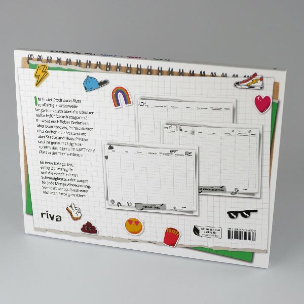 Ihr findet »Stadt Land Fluss« großartig, mittlerweile langweilen euch aber die üblichen nullachtfünfzehn Kategorien? Ihr wollt euch lieber Gedanken über Dancemoves, Peinlichkeiten und Kuchen machen anstatt über Städte und Flüsse? Dann seid ihr genau richtig: Hier kommt das legendäre »STATT Land Fluss« in der witzigen Teenie-Edition!- 60 neue Kategorien- 5 lustige Zusatzregeln- 6 spaßige Extrem-Modi- 5 verschiedene Schwierigkeitsstufen- 100 Prozent Abwechslung und Spaß für eure nächste Party (lib)