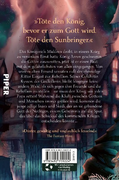 'Töte den König, bevor er zum Gott wird. Töte den Sunbringer.'Das Königreich Middren droht, in einem Krieg zu versinken: Einst hatte König Arren geschworen, die Götter auszurotten, jetzt ist er einen Pakt mit dem gefährlichsten von allen eingegangen. Von seinem alten Freund verraten ruft der ehemalige Ritter Elogast zur Rebellion. Seiner Gefährtin Kyssen, der Godkillerin, bleibt hingegen keine andere Wahl, als sich gegen ihre Freunde und die Rebellion zu stellen - sie muss den König um jeden Preis retten! Während die Kluft zwischen Göttern und Menschen immer größer wird, kommen die junge adlige Inara und Skedi, der an sie gebundene Gott der Notlügen, einem Geheimnis auf die Spur, das über das Schicksal des kommenden Krieges entscheiden könnte ...'Düster, gewaltig und unglaublich fesselnd.' The Fantasy Hive (lib)