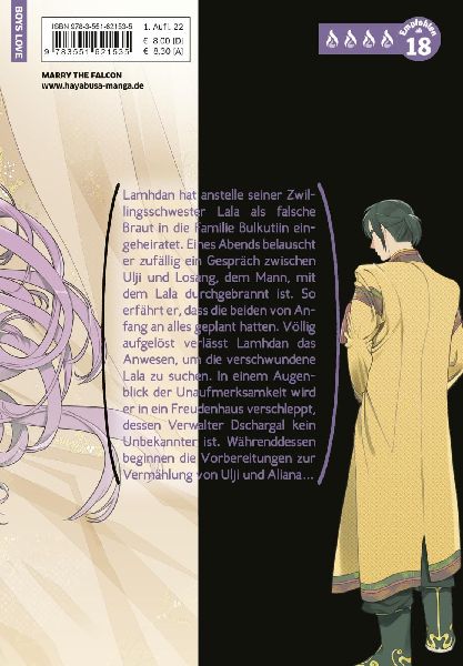 Ein hocherotischer Boys Love in opulentem Fantasy-Setting - wunderschön in Szene gesetzt von Tamekou, der Mangaka von MY GENDERLESS BOYFRIEND! Lamhdan hat anstelle seiner Zwillingsschwester Lala als falsche Braut in die Familie Bulkutiin eingeheiratet. Eines Abends belauscht er zufällig ein Gespräch zwischen Ulji und Losang, dem Mann, mit dem Lala durchgebrannt ist. So erfährt er, dass die beiden von Anfang an alles geplant hatten. Völlig aufgelöst verlässt Lamhdan das Anwesen, um die verschwundene Lala zu suchen. In einem Augenblick der Unaufmerksamkeit wird er in ein Freudenhaus verschleppt, dessen Verwalter Dschargal kein Unbekannter ist. Währenddessen beginnen die Vorbereitungen zur Vermählung von Ulji und Aliana... Weitere Informationen: Spice-Level: 4 von 4 Flammen. Ein unzensierter +18-Titel mit vielen heißen Szenen für Kenner*innen des Genres. Schärfer geht's nicht! (lib)
