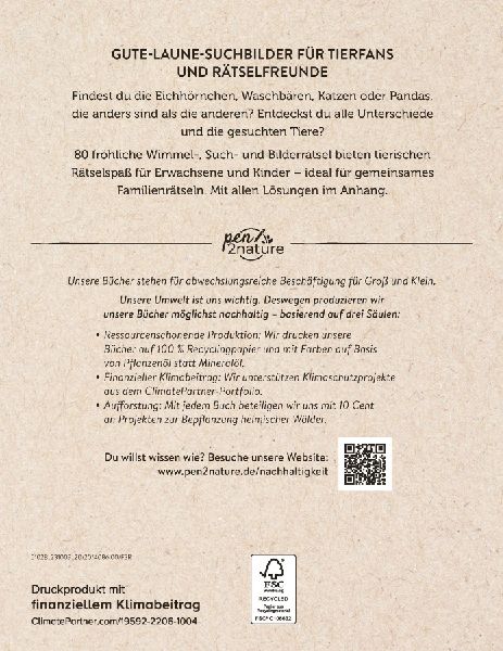 Witzige Suchrätsel für Tierfans . 80 Wimmel-, Such- und Bilderrätsel, die garantiert für gute Laune sorgen . Für große und kleine Tierfreunde, die Spaß an witzigen und kniffligen Suchrätseln haben . Mit allen Lösungen im Anhang . Vermeidung von Emissionen: Gedruckt wird mit Farben ohne Mineralöl und auf 100 % Recyclingpapier . Klimaneutrale Produkte durch Ausgleich der Rest-Emissionen per Unterstützung von Umweltprojekten . Aufforstung: Mit jedem Buch beteiligt sich der Verlag mit 10 Cent an Projekten zur Bepflanzung heimischer Wälder Findest du die Eichhörnchen, Waschbären, Katzen oder Pandas, die anders sind als die anderen? Oder die beiden Eulen, Schmetterlinge, Hasen, die genau gleich sind? Erkennst du die Unterschiede zwischen den beiden auf den ersten Blick identisch scheinenden Bildern? Entdeckst du das einmalige Zebra? Siehst du das verliebte Bärchen auf den ersten Blick? 80 tierisch-fröhliche Such- und Wimmelbilder bieten großen Rätselspaß und witziges Gehirnjogging der ganz anderen Art. Für Erwachsene und Kinder, auch bestens geeignet für gemeinsames Familienrätseln. Ob Zeitvertreib zwischendurch oder im Urlaub, Gedächtnistraining oder unterhaltsame Beschäftigung, diese tierischen Suchrätsel machen einfach Spaß. Hier werden Tierfreunde zu Rätselfans - und umgekehrt. Ein perfektes Geschenk für alle Katzenliebhaber und Hundeeltern, für Zoofreunde und Insektenforscher und einfach alle, die Spaß an witzigen Rätseln haben. Für mehr Nachhaltigkeit im Alltag: Dieses Buch wurde mit Farben ohne Mineralöl und auf 100 % Recyclingpapier gedruckt. Rest-Emissionen werden durch die Unterstützung von Umweltprojekten ausgeglichen. Zusätzlich beteiligt sich der Verlag pen2nature mit jedem Buch mit 10 Cent an Projekten zur Bepflanzung heimischer Wälder. Wie genau das alles funktioniert? Auf seiner Website informiert der Verlag ausführlich und transparent darüber. (lib)