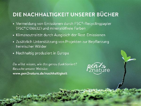 Für mehr Nachhaltigkeit im Alltag: Dieses Buch wurde mit Farben ohne Mineralöl und auf 100 % Recyclingpapier gedruckt. Rest-Emissionen werden durch die Unterstützung von Umweltprojekten ausgeglichen. Zusätzlich beteiligt sich der Verlag pen2nature mit jedem Buch mit 10 Cent an Projekten zur Bepflanzung heimischer Wälder. Wie genau das alles funktioniert? Auf seiner Website informiert der Verlag ausführlich und transparent darüber.