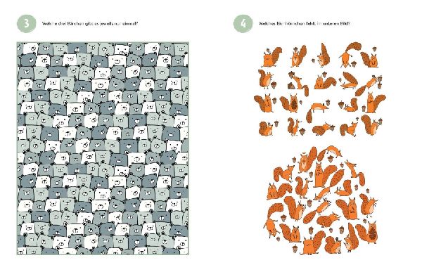 Findest du die Eichhörnchen, Waschbären, Katzen oder Pandas, die anders sind als die anderen? Oder die beiden Eulen, Schmetterlinge, Hasen, die genau gleich sind? Erkennst du die Unterschiede zwischen den beiden auf den ersten Blick identisch scheinenden Bildern? Entdeckst du das einmalige Zebra? Siehst du das verliebte Bärchen auf den ersten Blick?