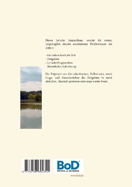 Dieser lyrische Sammelband vereint die ersten, ursprünglich einzeln erschienenen Publikationen des Autors: - Gedanken durch die Zeit- Zeitgeister- Lyrische Fragezeichen- Besinnliches KaleidoskopEin Potpourri aus Gedankenkreisen, Reflexionen, sowie Frage- und Ausrufezeichen des Zeitgeistes in meist einfacher, klassisch gereimter oder ungereimter Form. (lib)
