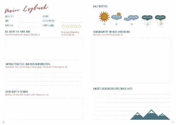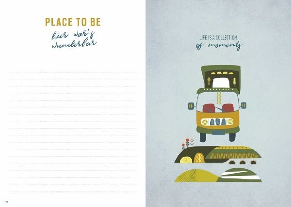 Das Reisen mit dem Van ist abwechslungsreich: Grenzenlose Freiheit und unendliche Spontaneität führen dich durch unberührte Schönheiten und zu wahren Geheimtipps. Dieses Logbuch hilft dir, alle Erinnerungen festzuhalten und für immer greifbar zu machen. Individuell und liebevoll Illustriert, bietet das Van-Tagebuch ausreichend Platz für Fotos, Notizen und Kritzeleien. So entsteht unterwegs eine ganz persönliche Sammlung, die für immer bleibt. (lib)