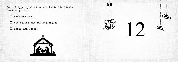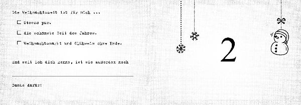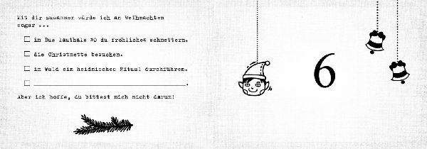 Vorfreude ist die schönste Freude: Diese neue Ausgabe des beliebten Adventskalenderklassikers zum individuellen Ausfüllen, Ankreuzen und Vervollständigen ist die perfekte Möglichkeit, der besten Freundin, einem guten Freund oder dem Lieblingskollegen die Adventszeit zu verschönern. Hinter jeder Seite verbirgt sich eine liebevolle und originelle Botschaft, die vom Schenkenden individuell von Hand ausgefüllt wird. So ist dieser kleine Adventskalender ein ganz persönliches Geschenk und ein einmaliger Freundschaftsbeweis, der die Vorweihnachtszeit garantiert unvergesslich macht. (lib)